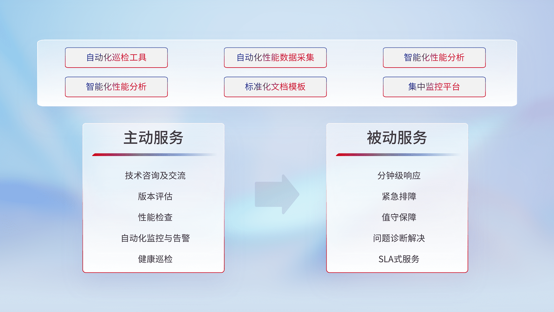 智能化工具和标准化文档,,,,保障服务质量,,提供主动服务(包含技术咨询、、、、版本评估、、性能检查、、、、自动化监控与告警、、健康巡检)和被动服务包含(分钟级响应、、、、紧急排障、、值守保障、、、问题诊断解决、、、、SLA服务)。。。。